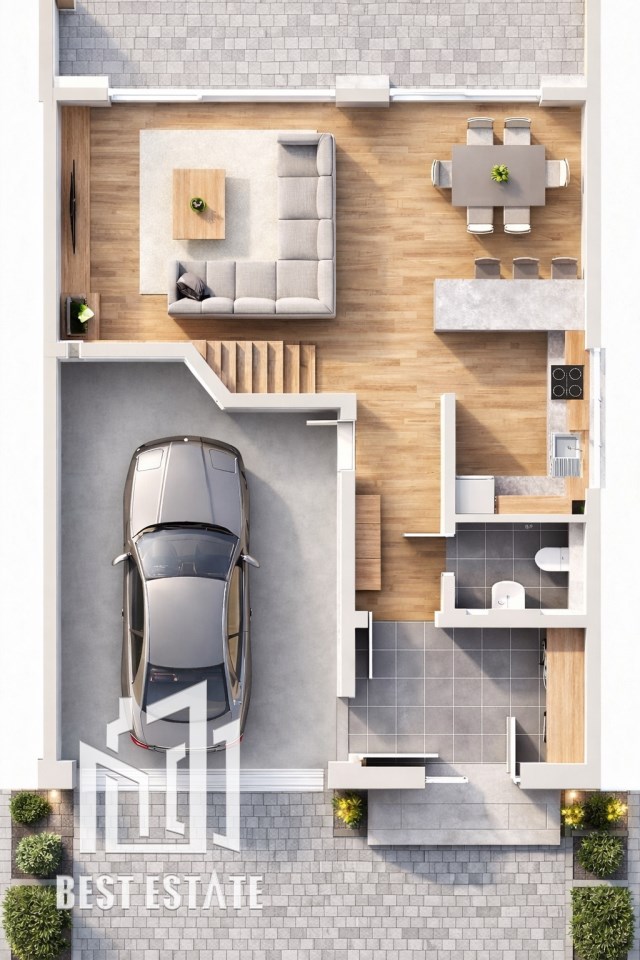 Wykończenie realizowane jest bez mebli ruchomych, co daje przyszłym właścicielom możliwość urządzenia domu zgodnie z własnym stylem i potrzebami rodziny.