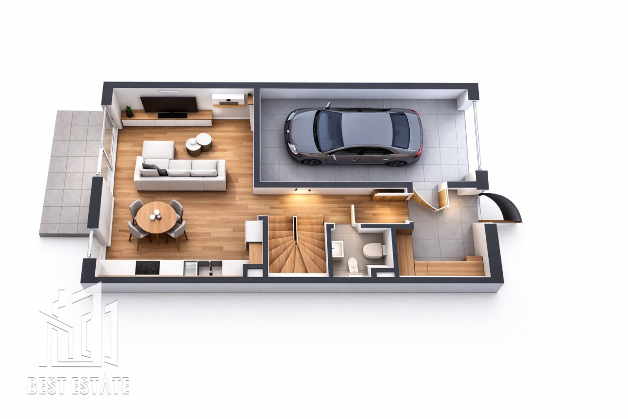 Wykończenie realizowane jest bez mebli ruchomych oraz sprzętu AGD, co daje przyszłym właścicielom możliwość urządzenia domu zgodnie z własnym stylem i potrzebami rodziny.