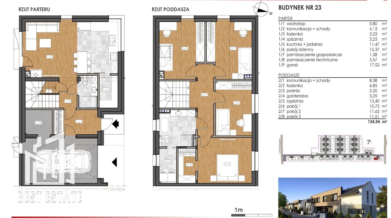 Powierzchnie domów od 121,27 m2 do 134,54 m2.
