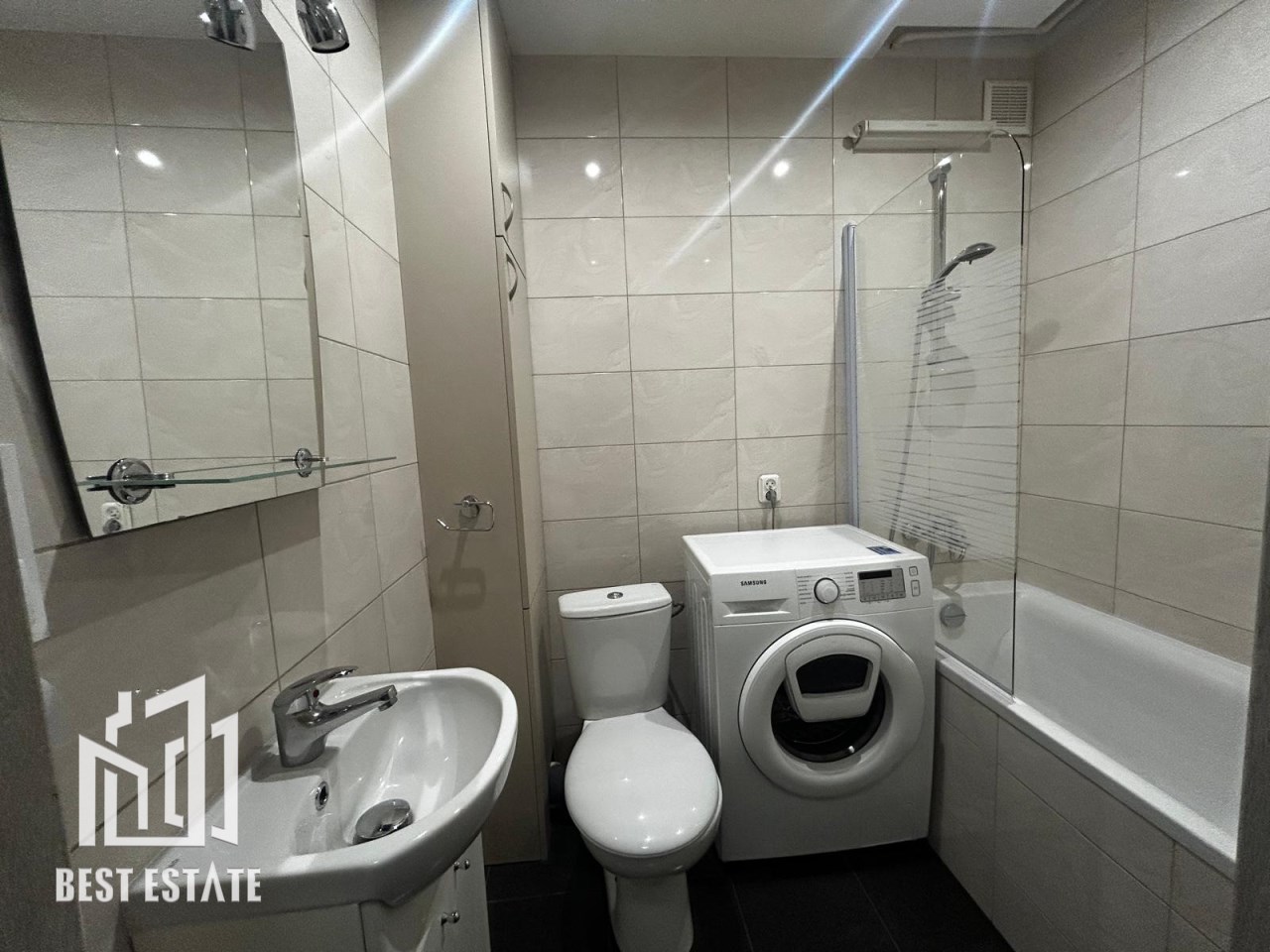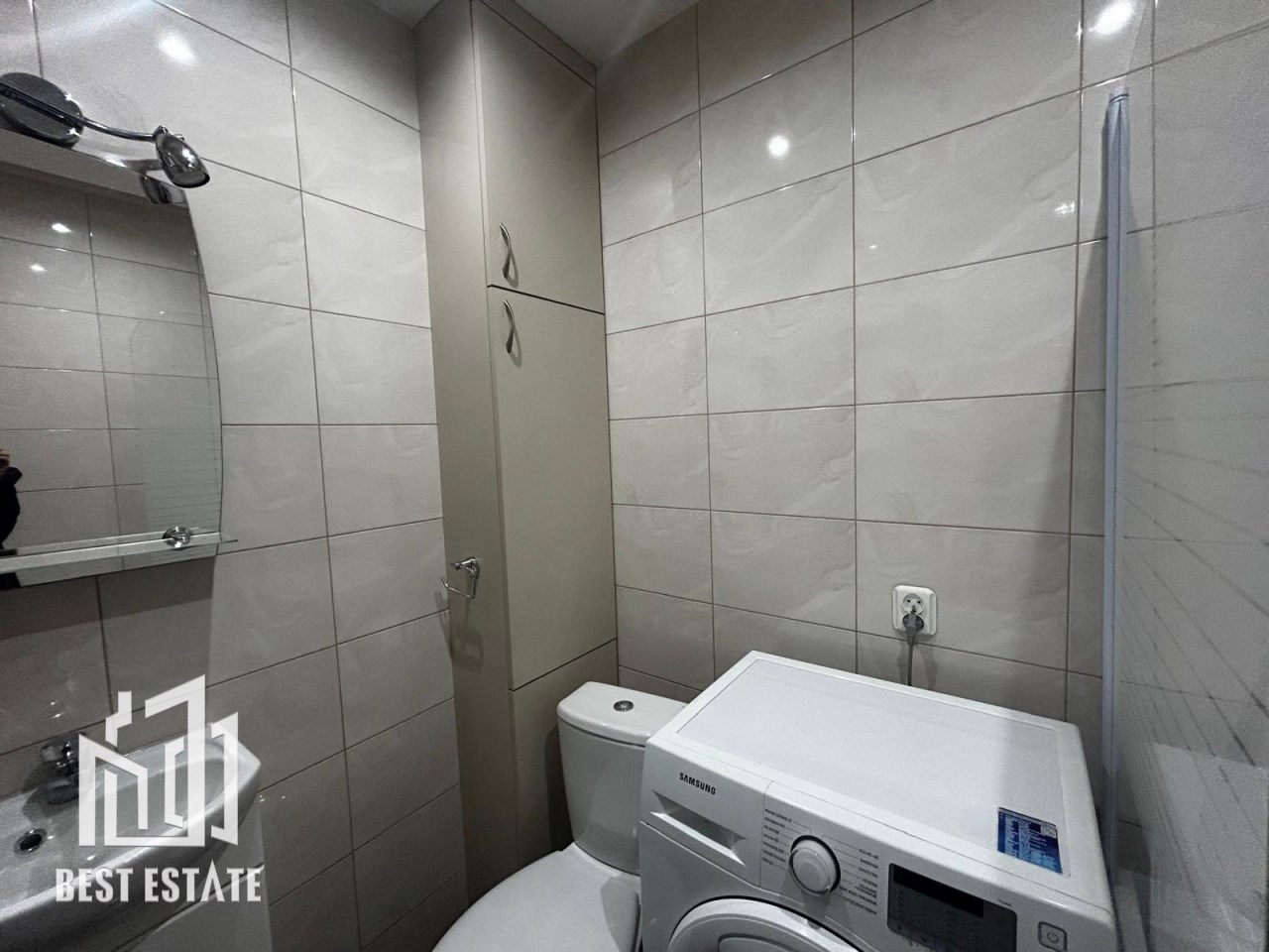 Mieszkanie składa się z jednego ustawnego pokoju oraz oddzielnej kuchni (tak, gotowanie nie musi odbywać się obok łóżka – luksus!). Do dyspozycji łazienka z pralką i wygodnymi szafeczkami.