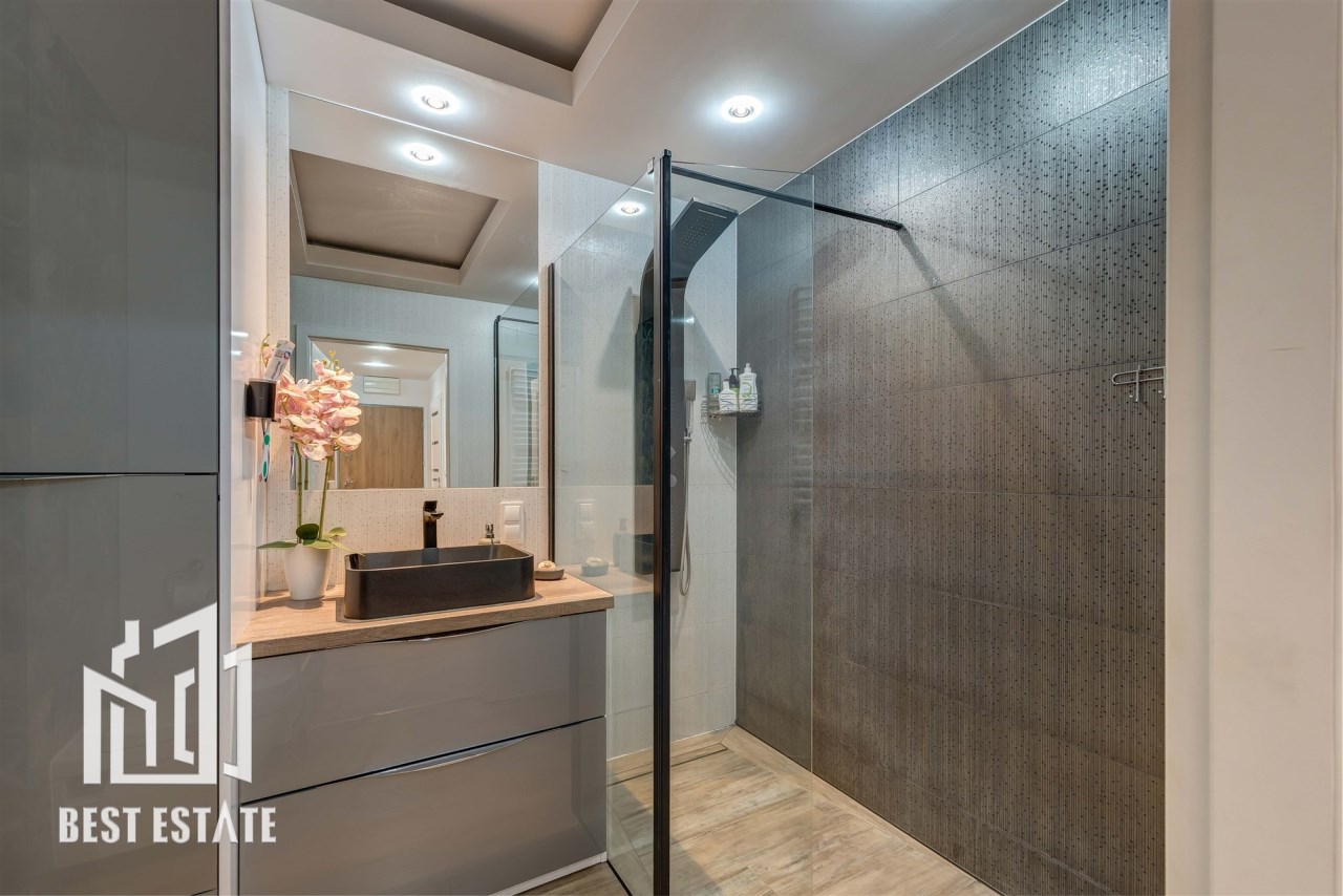 Łazienka – nowoczesna, z kabiną prysznicową i licznymi zabudowami na wymiar.